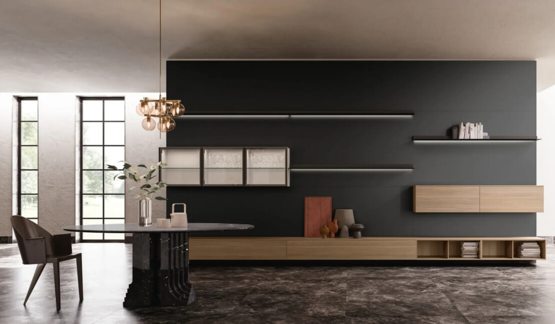 Vuoi ammobiliare un soggiorno pratico e operativo? Ti offriamo la parete attrezzata SpaceMakers day SM2225 Zalf dalle forme decise moderne.